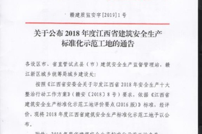 一年来,我公司始终以争创安全文明工地活动为契机,把创建安全文明工地作为提高施工安全生产、文明施工水平、改善现场作业环境的主要抓手,大力开展施工现场管理制度化、规范化、标准化、长效化建设活动,督促公司在建工程积极参与创建活动。 2018年全年安全创优工作取得了显著成绩,江西省建筑工程安全质量监督管理局发布公告,我司承建的南水.中央公园(一期)项目被评为“2018年度江西省建筑安全生产标准化示范工地